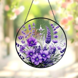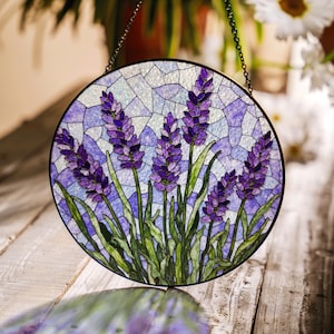 Lavender flower stained glass window round suncatcher handmade gift for mom or garden lover