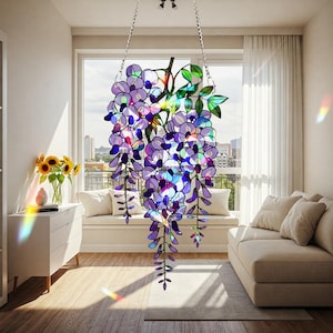 Purple Wisteria Suncatcher, Stained Glass Acrylic Floral Window Hanging