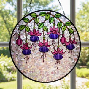 Fuchsia Flower Stained Glass Suncatcher, Pink Purple Floral Window Hanging Decor, Elegant Botanical Glass Art Gift