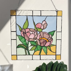 Peony Flower Suncatcher Pink Green Leaf. Stained glass Home Decor Panel Garden Window Wall Hangings Gift. Mother’s day gift