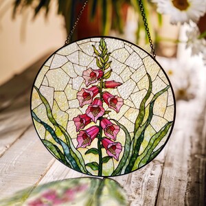 Pink foxglove flower stained glass circle suncatcher floral window decor gift for nature lovers