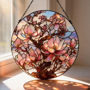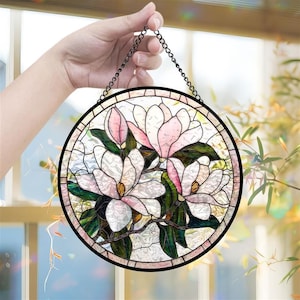 Pink Magnolia Suncatcher, Stained Glass Style Window Hanging, Floral Spring Decor