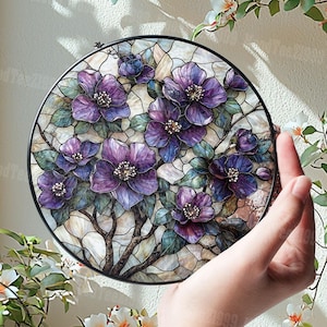 Lavender flower stained glass window round suncatcher handmade gift for mom or garden lover