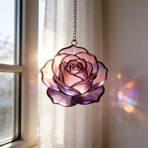 Romantic Pink Purple Rose Stained Glass Suncatcher, Mother’s Day Decor, Special Gifts for Women, Valentine’s Gifts for Girlfriend