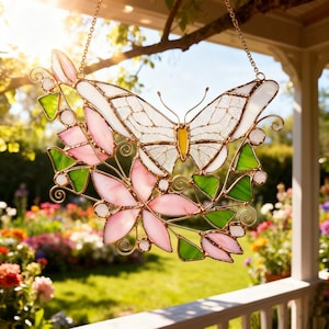 Stained Glass Butterfly Suncatcher – Pink Flower Window Decor