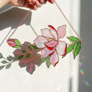 Stained Glass Magnolia Suncatcher, Pink Flower Window Hanging, Spring Mother’s Day Gift for Mom