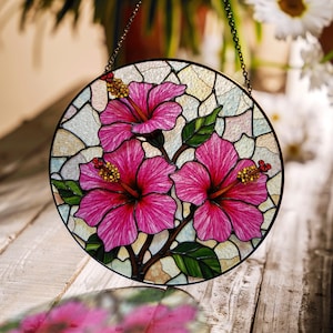 vibrant pink hibiscus glass panel floral stained glass suncatcher handmade decor gift for garden lovers